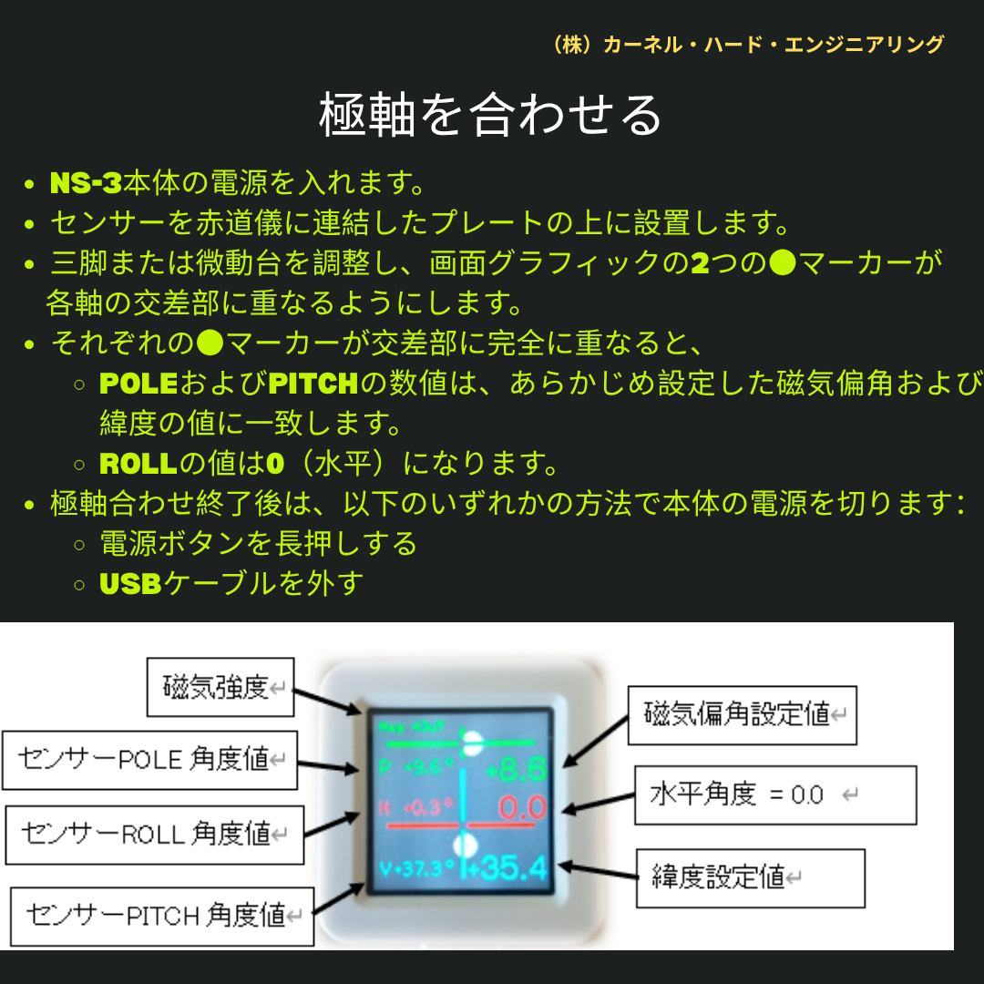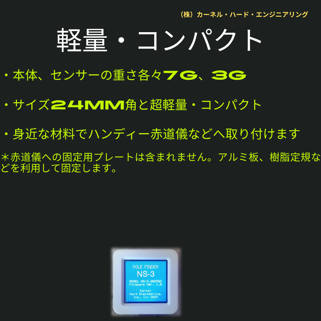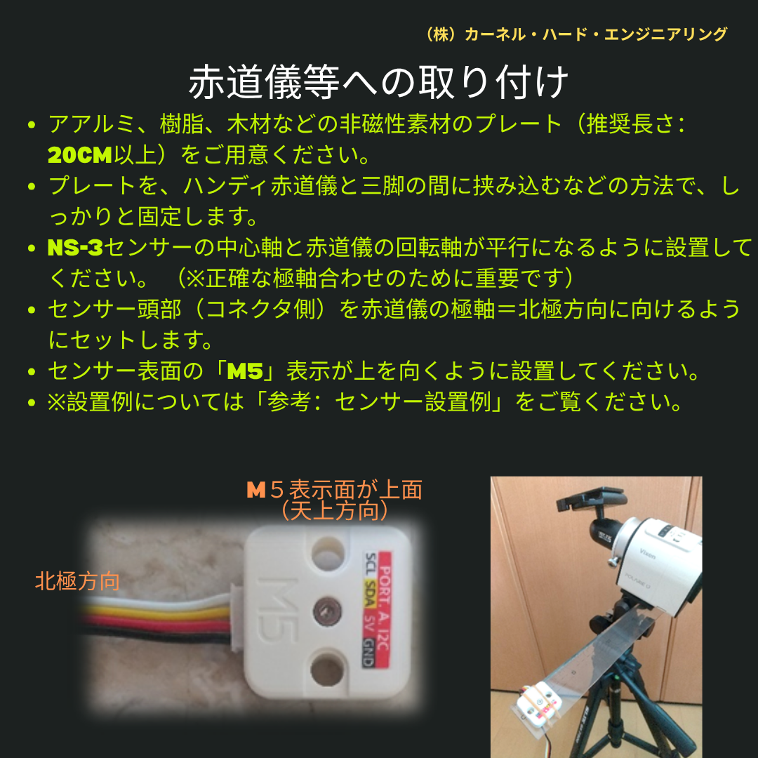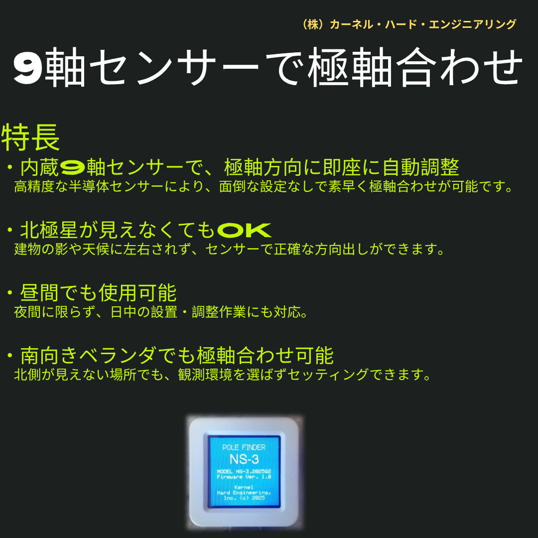 - 9軸センサーを内蔵し、設定した緯度における赤道儀の極軸(北極星方向)の設定を短時間に簡単におこなうことが出来ます。